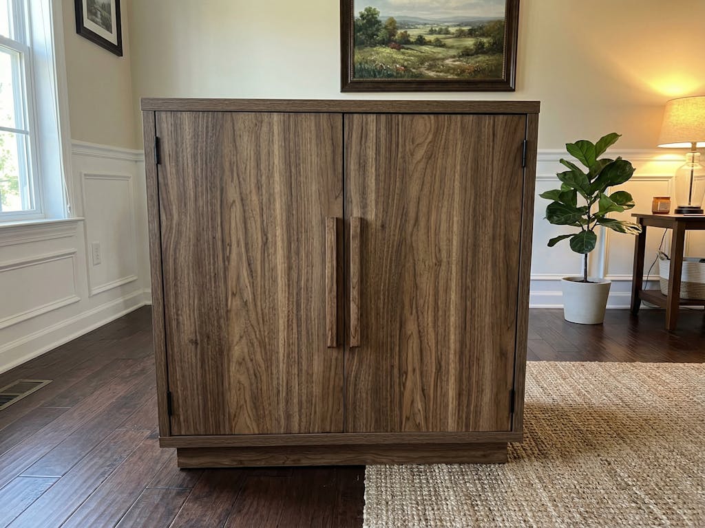 Overall, I'm very satisfied. Its mid-century modern design and walnut veneer look fantastic, and the storage space is incredibly flexible—I use it to store all sorts of odds and ends. Assembly was also very simple. The only thing I noticed was that the cabinet doors needed a slight adjustment to align perfectly, but that was to be expected. In short, if you want a cabinet that looks modern, clean, and offers ample storage, this is definitely worth the price.